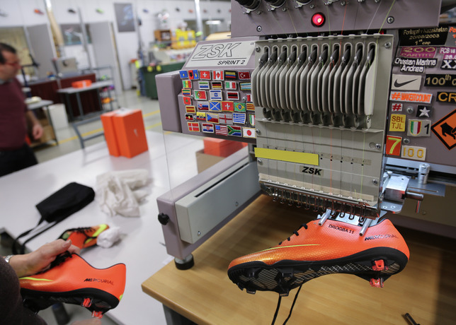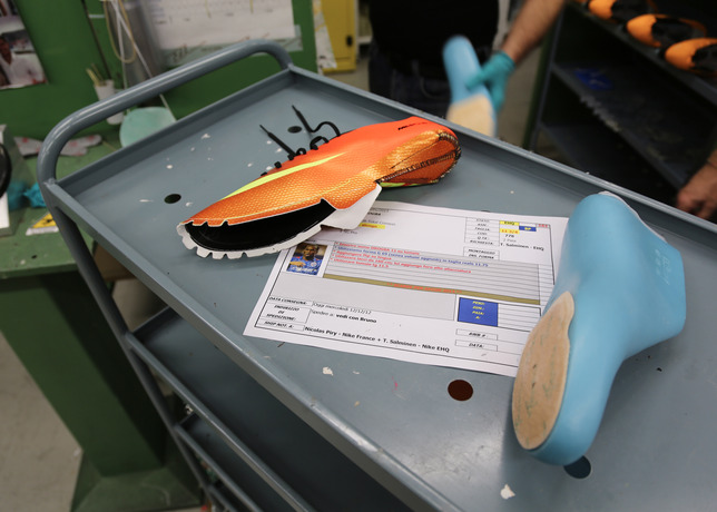 Para ilustrar esses processos, selecionamos algumas imagens da fábrica da Nike em Montebelluna (Itália) que mostram a produção da chuteira utilizada pelo marfinense Didier Drogba na Copa das Nações Africanas de 2013. O modelo fornecido para o atacante foi uma Nike Mercurial Vapor IX no esquema de cores Sunset.